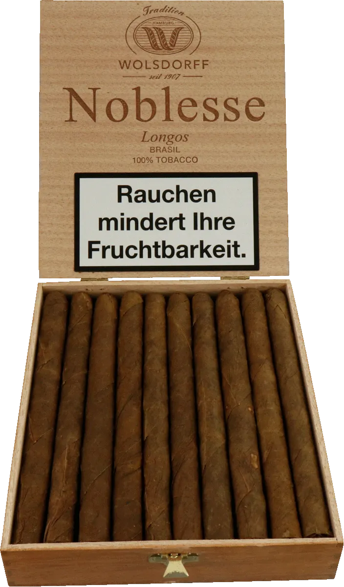 Mit der Auswahl des in Deutschland hergestellten Noblesse Longos Brasil Zigarillos, der ausschließlich aus 100% reinem Tabak besteht, haben Sie eine gute Wahl getroffen. Gefertigt in Deutschland und exklusiv für WOLSDORFF Tobacco hergestellt. In diesem exquisiten Produkt verschmelzen erlesene Tabake aus Java zu einem einzigartigen harmonischen Rendezvous von höchster Qualität. Die Herstellung erfolgt mit äußerster Sorgfalt, wobei ausschließlich erstklassige Tabaksorten aus dieser speziellen Region verwendet werden. Diese präzise Fertigungsweise und die Auswahl hochwertiger Tabaksorten machen ihn zu einem anspruchsvollen Begleiter für Kenner und Liebhaber feinster Tabakgenüsse.